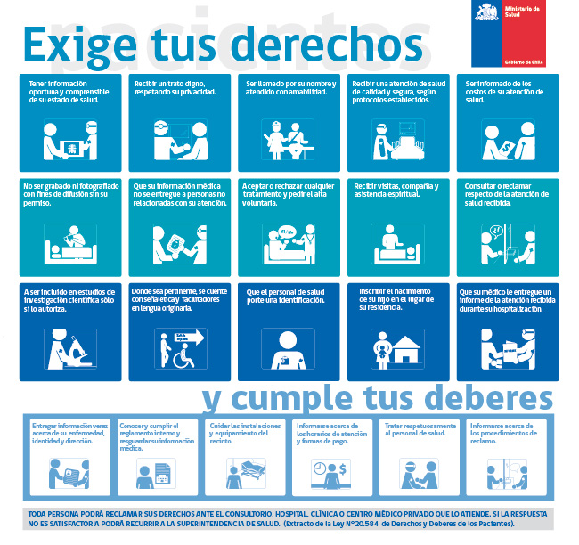 A continuación y en cumplimiento de la nueva disposición legal el Ministerio de Salud, dejamos a su disposición la resolución exenta que ''Determina el Contenido de la Carta de Derechos y Deberes de las Personas en relación con la Atención de Salud'', la carta de Derechos y Deberes de los pacientes en formato de imagen digital y el Manual Técnico de Normas Gráficas, que establece el correcto uso de dicha carta.